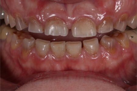 Mónica es un caso de desgastes muy severo y dientes con tinciones por haber tomado antibióticos con tetraciclina cuando era pequeña.
